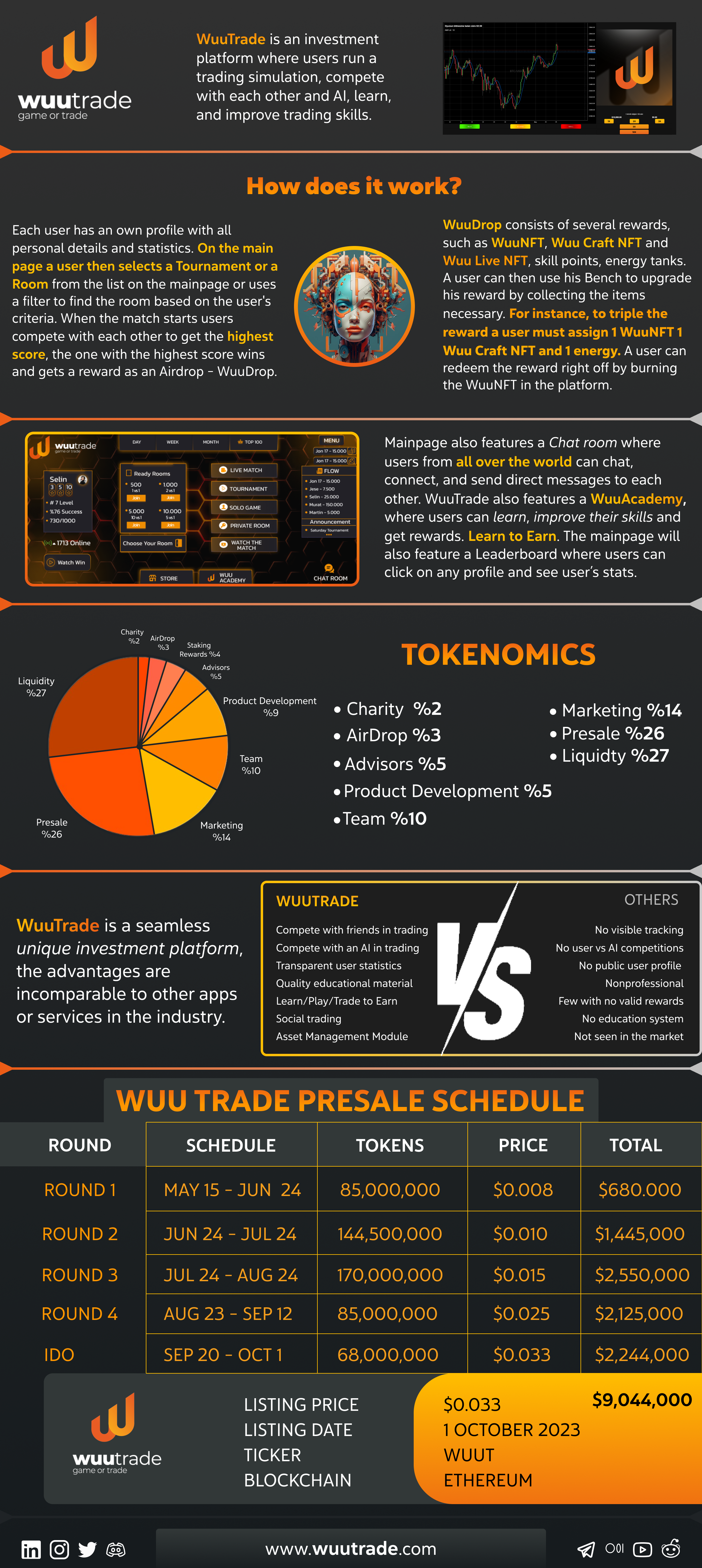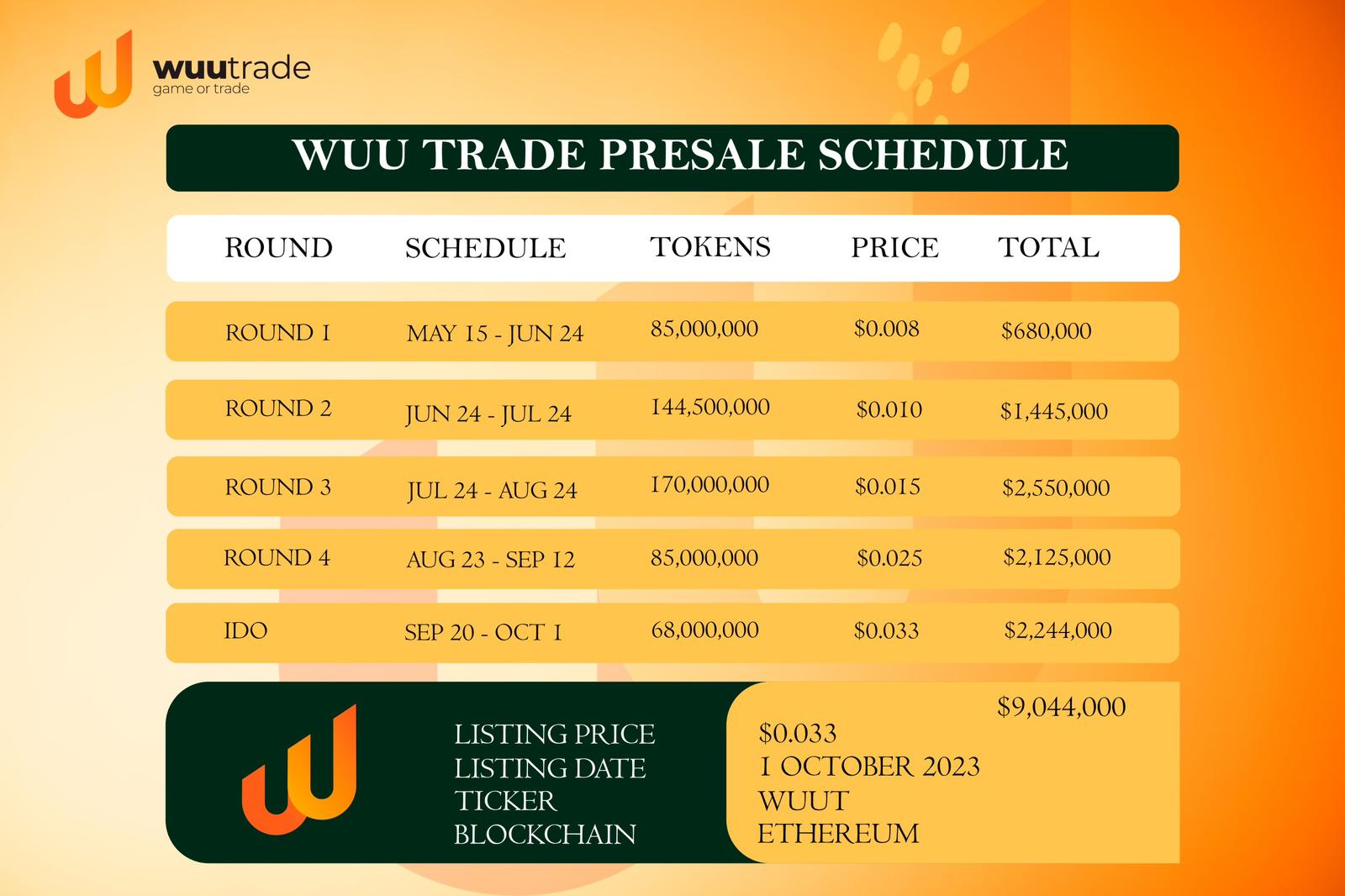 Whitepaper BUY NOW$WUUT token is used in various WuuTrade engagmenets, to enter tournaments and live matches in the web version and other in-app perks. Whether you are a WuuTrade user or just investing in the rise of the WuuTrade project, all WuuTrade investors will open the door to great profits as the $WUUT ecosystem is built on a great balance by itself. With 8,500,000,000 Supply, $WUUT has been carefully planned in every part of it.